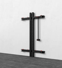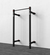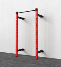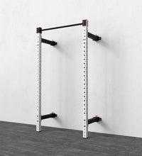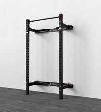 The Lethal wall-mounted folding rack is a great space saving heavy duty built rack. You can fold this in to the wall when not in use in order to take up almost no space (only about 3" off wall when folded in). This is built commercially with the use of 11 gauge steel and 3" x 3" uprights. This rack comes as picture shown with it folded out. That includes the pull-up bar and also DOES INCLUDE J-CUPS (not pictured), so you are ready to workout immediately without buying any accessories.